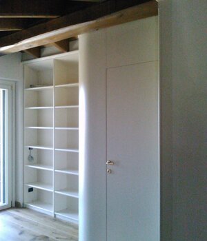 Arredamento completo per una mansarda.materiale: listellare laccato