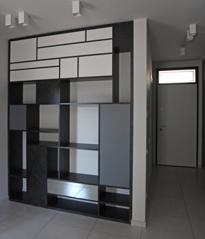 Questo progetto è stato realizzato dall' Arch. Marcello Cesini; la richiesta del cliente era quella di realizzare l'arredo nella zona giorno(ingresso e soggiorno) e un mobile per la zona notte utilizzando uno stile minimale che non fosse in contrasto con il resto della casa.